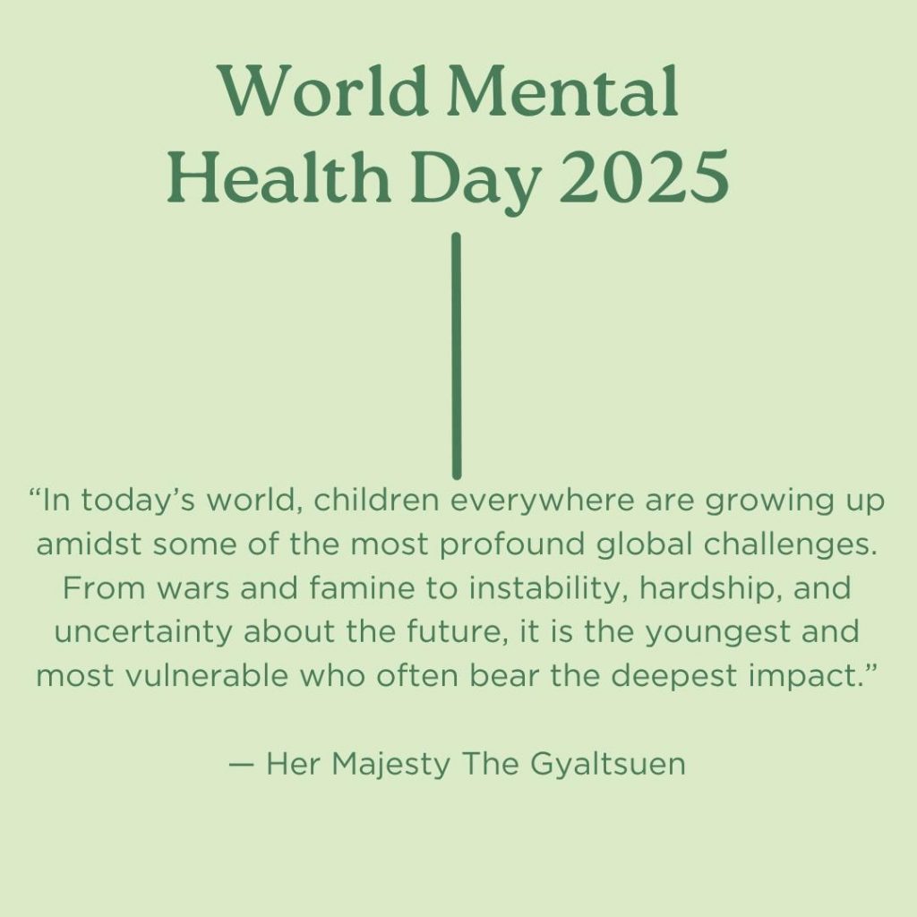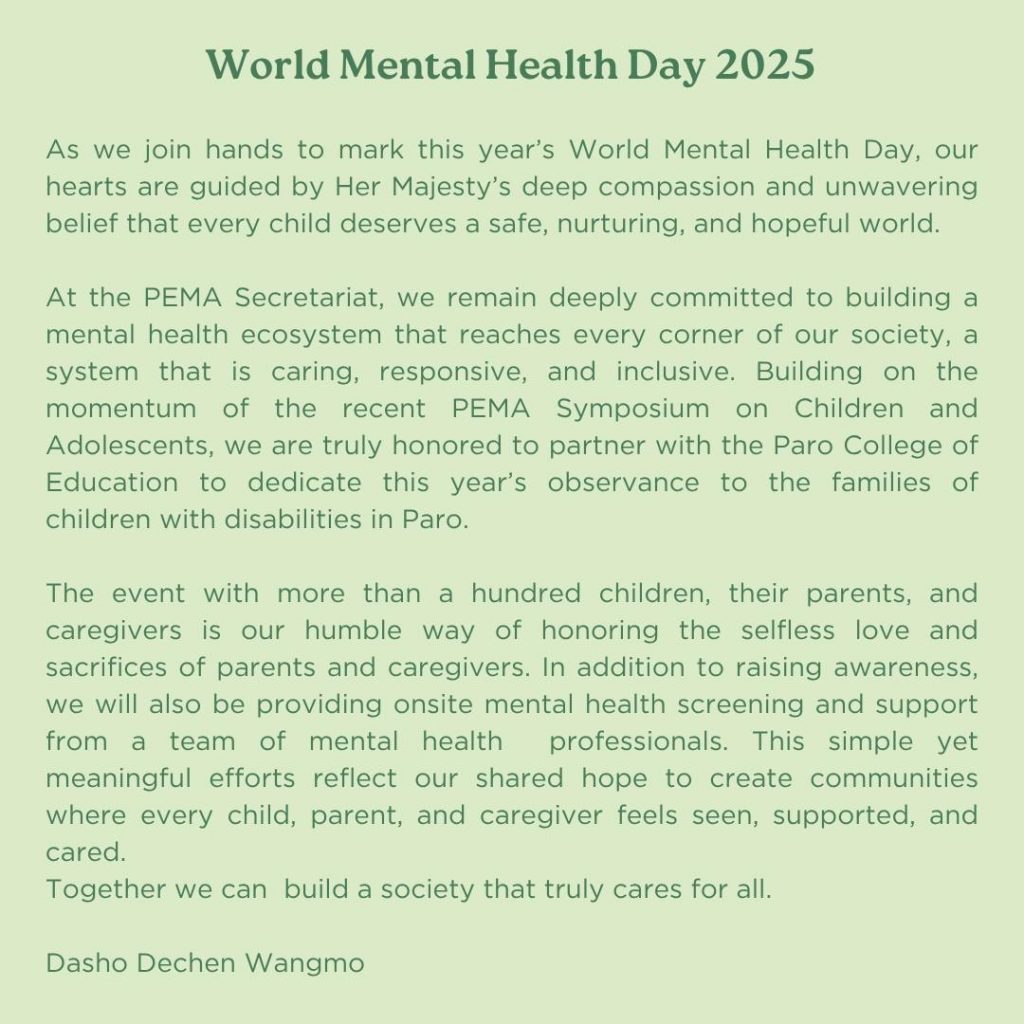 In observance of this year’s World Mental Health Day, The PEMA Secretariat reaffirms its commitment to promoting the mental well-being of children and young people. Guided by Her Majesty The Gyaltsuen’s vision, our approach continues to focus on creating safe, nurturing, and supportive environments where every child can grow with resilience and hope. 💚
